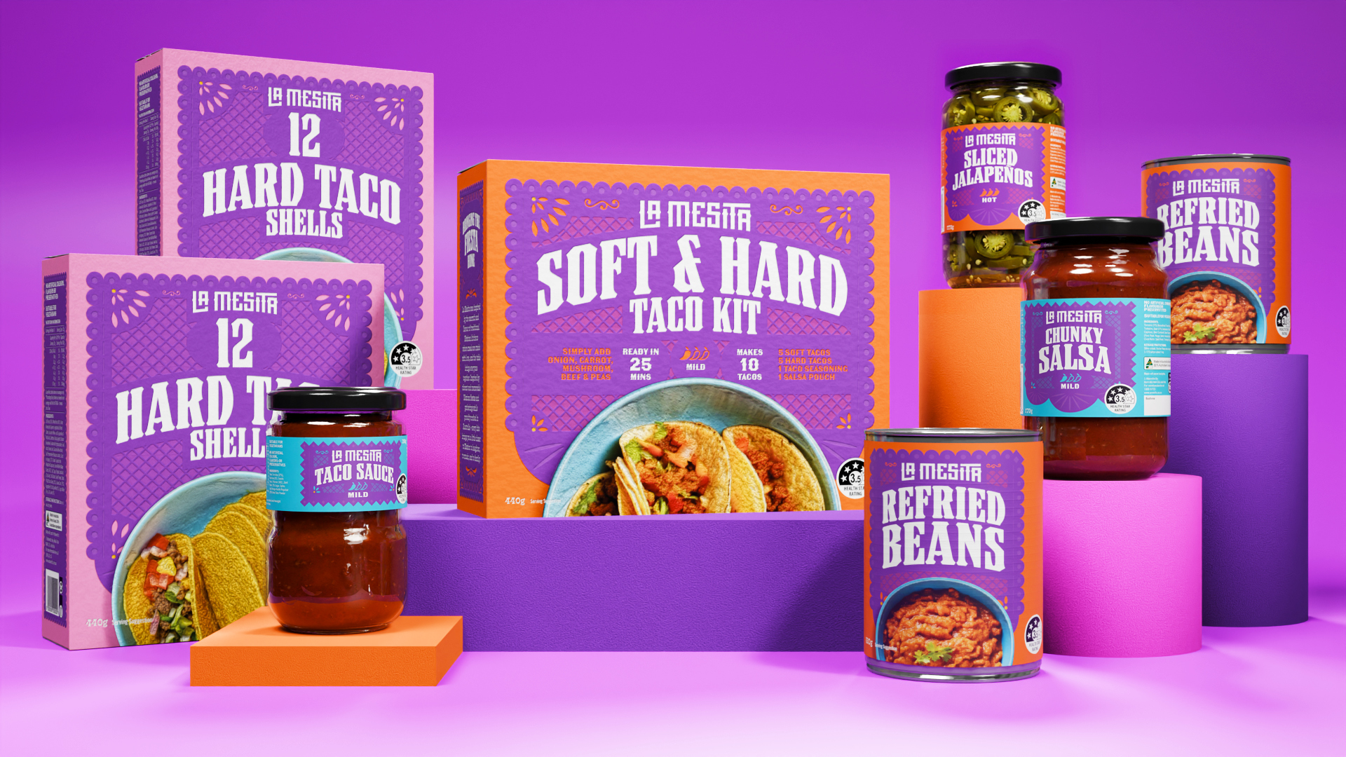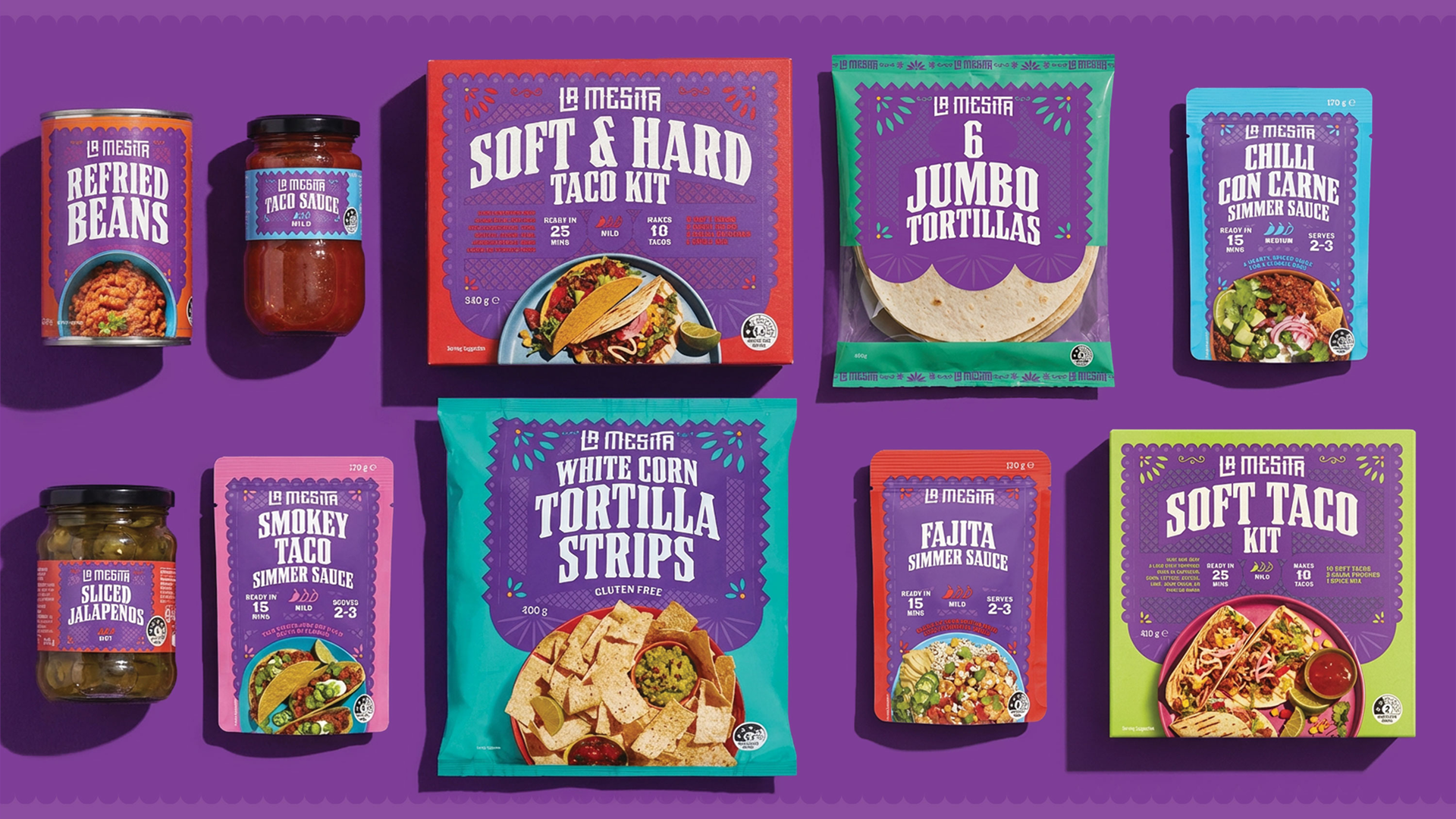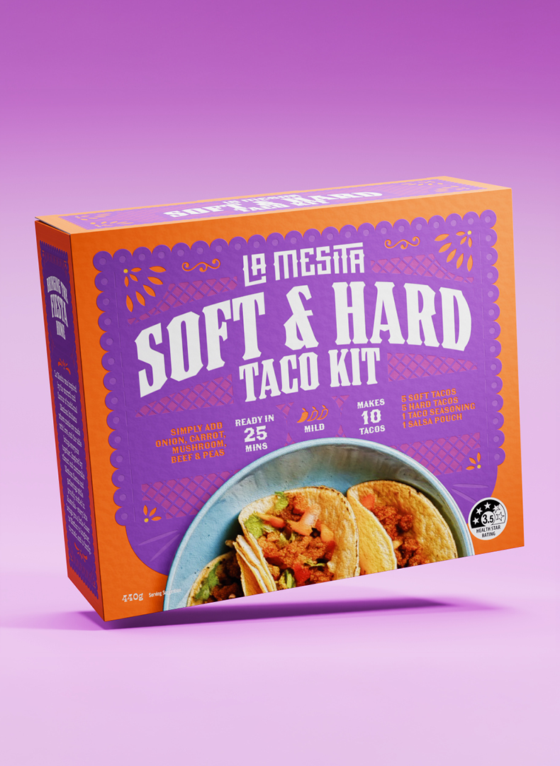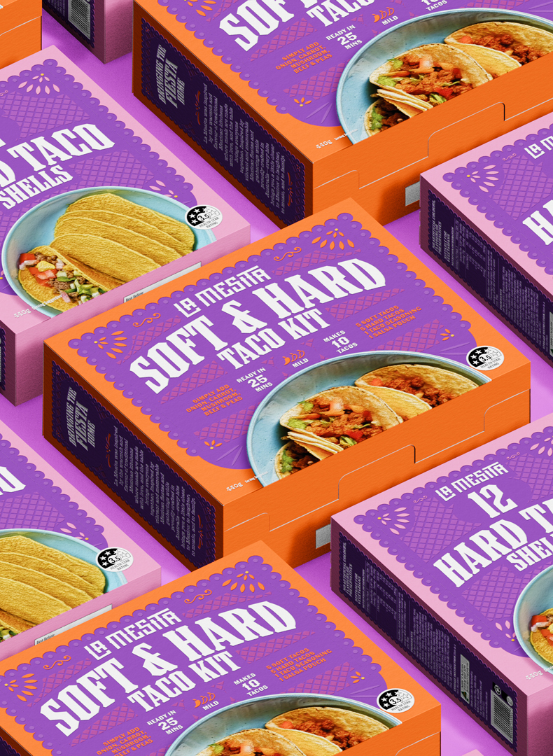 The central challenge was differentiation. The Mexican category is dominated by a single mainstream player and crowded with dated “Tex-Mex” cues, generic colour palettes, and low perceived authenticity. To stand apart, the design needed to feel genuinely Mexican while remaining modern, ownable, and scalable across a broad multi-SKU range.
